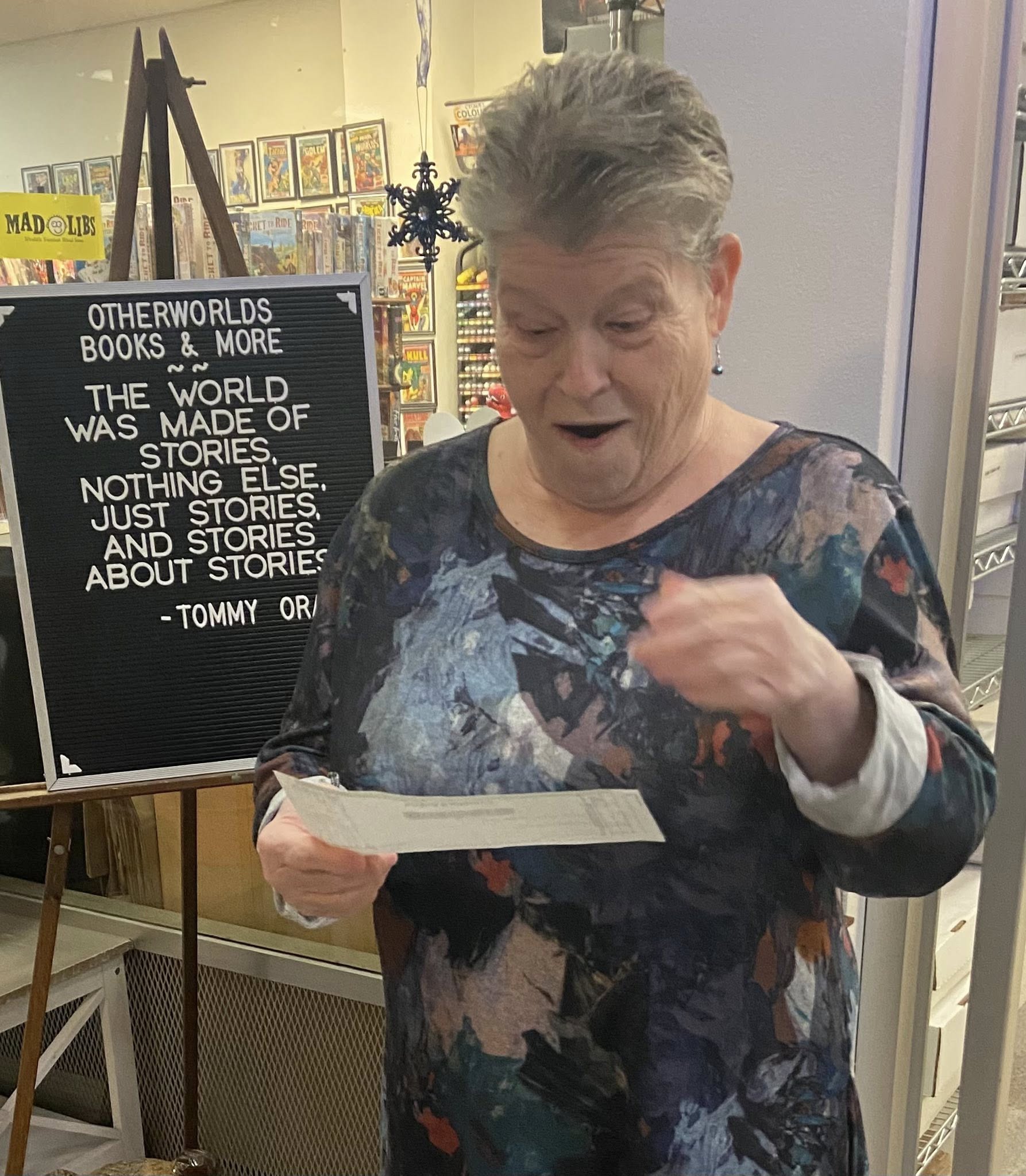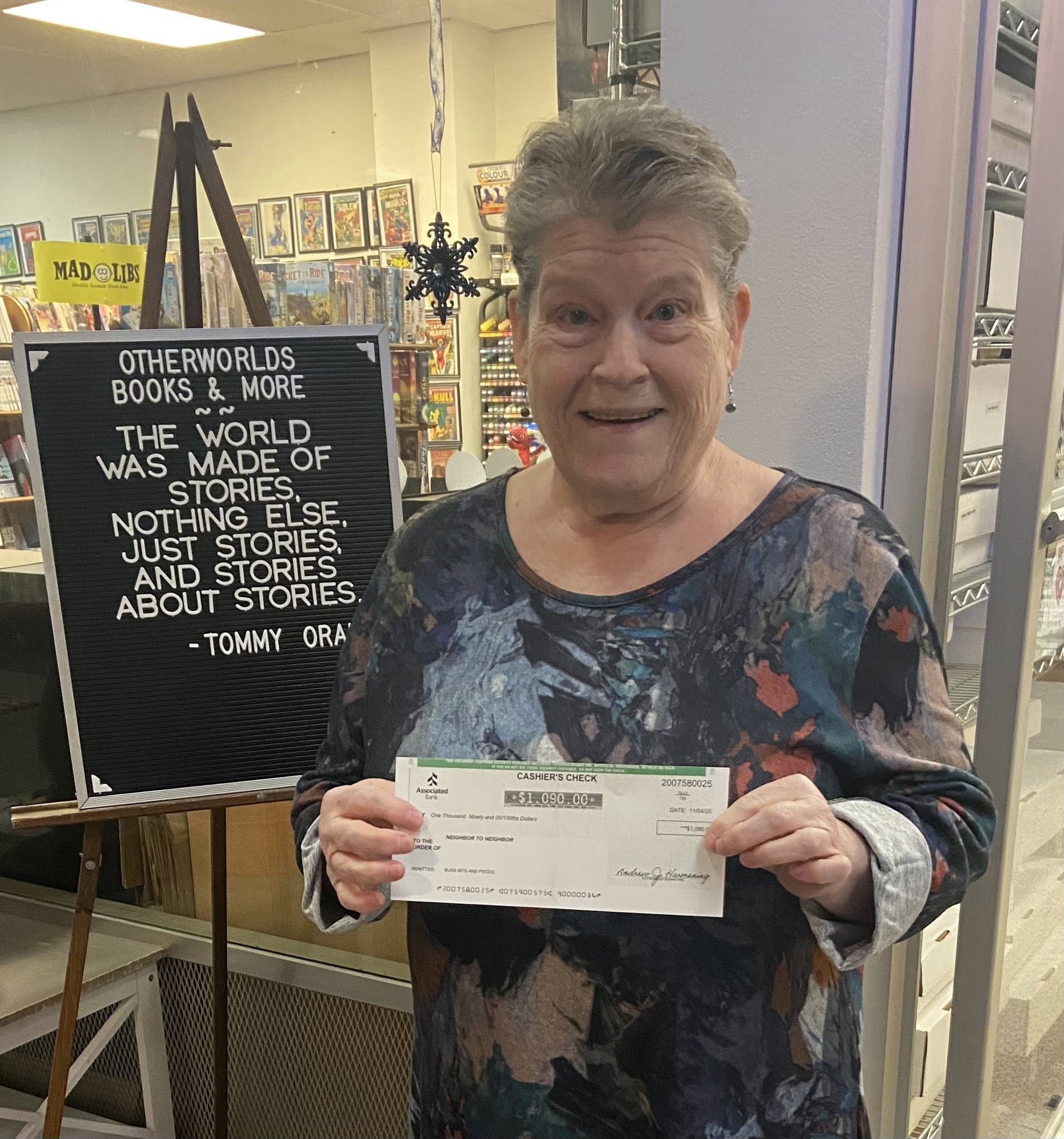 Thank you to Other Worlds Books and More for holding a Tip Jar Fundraiser for Neighbor to Neighbor in October 2025. We truly appreciate the support! Thanks to all who made contributions to the Tip Jar during October 2025, and to David & Margaret Magle for choosing to support our organization. We received a check for $1,090.00. Pictured in the photos below: Ann Bennett, Neighbor to Neighbor Executive Director.